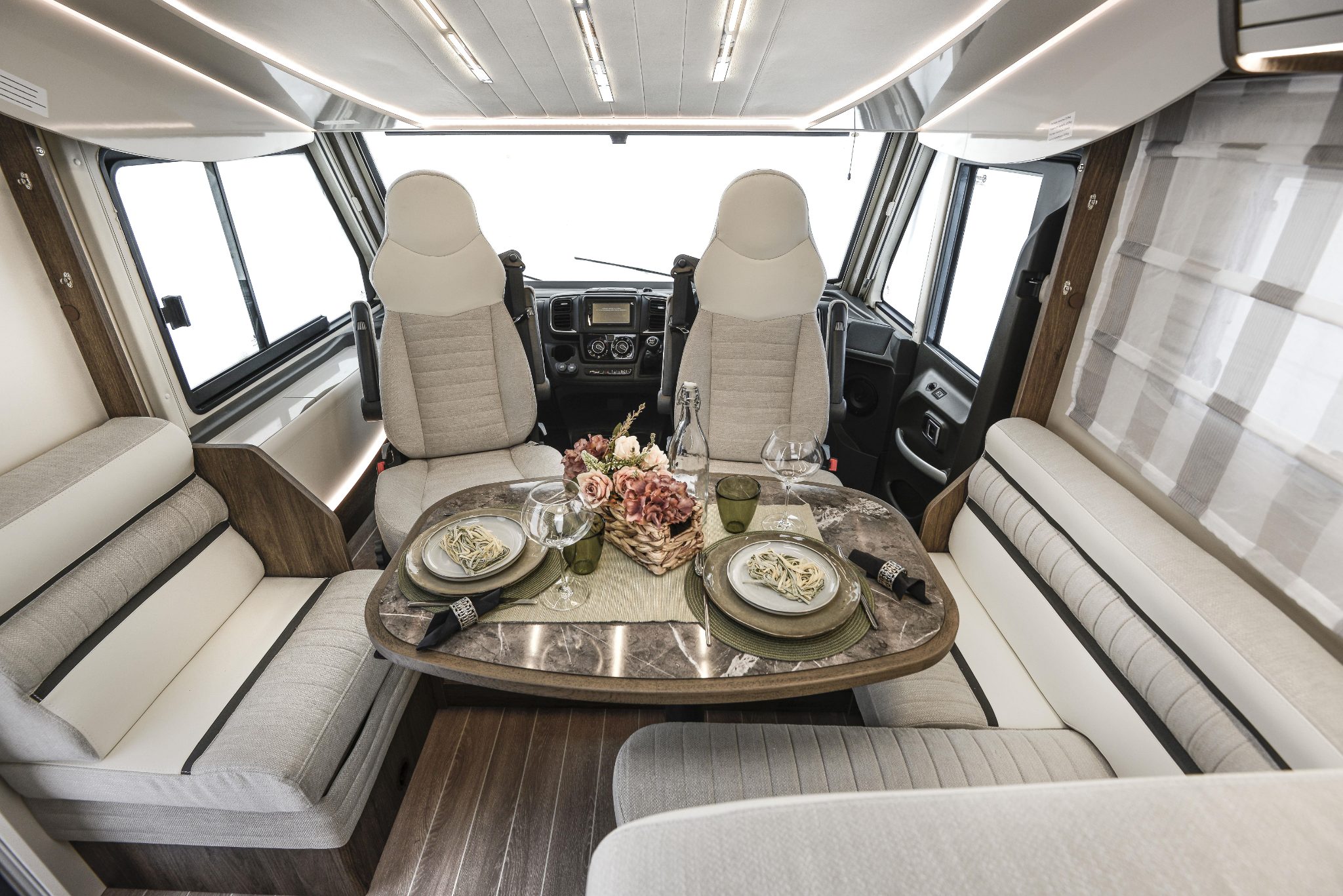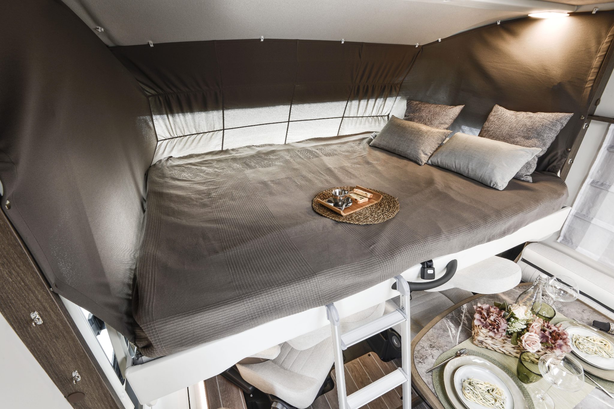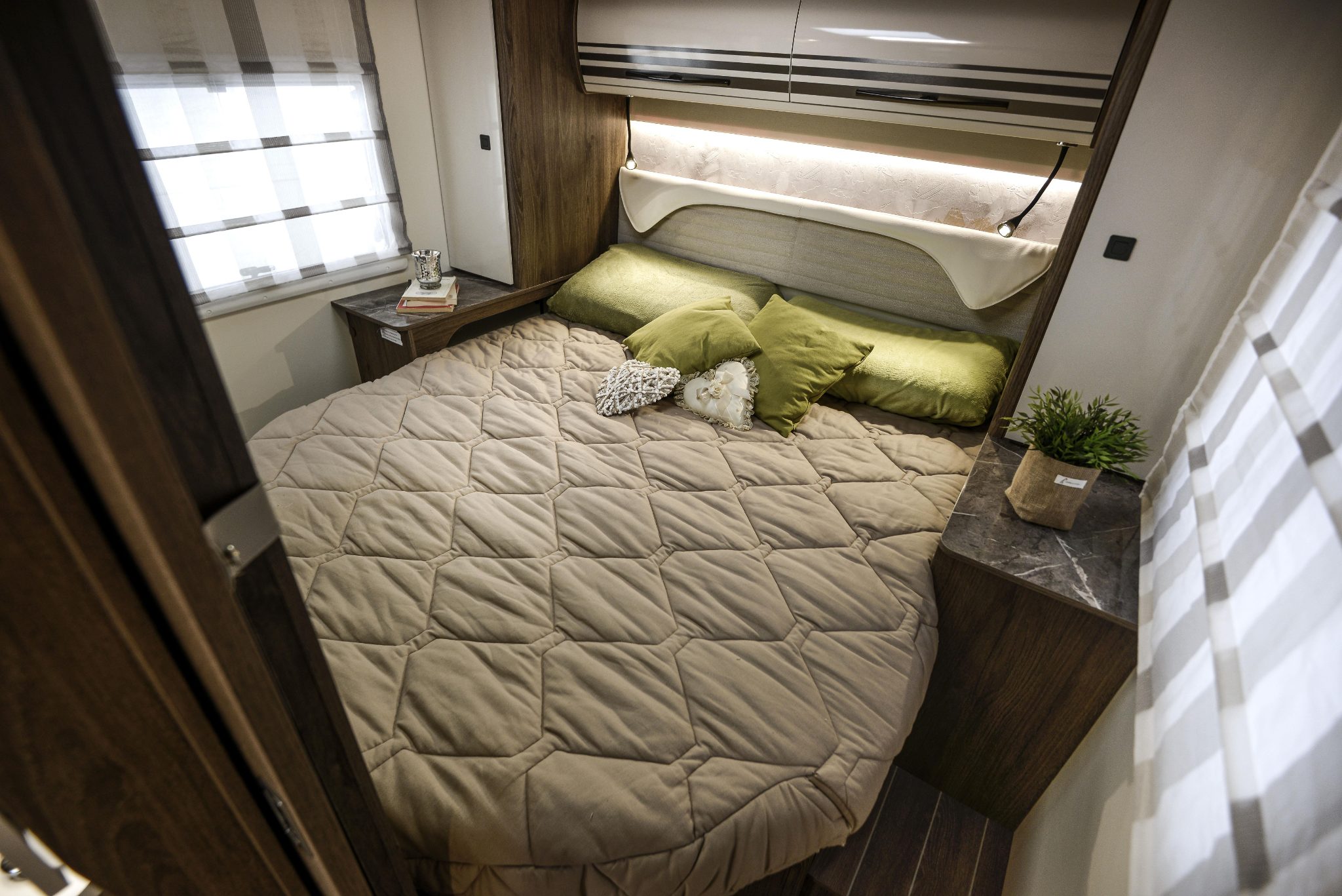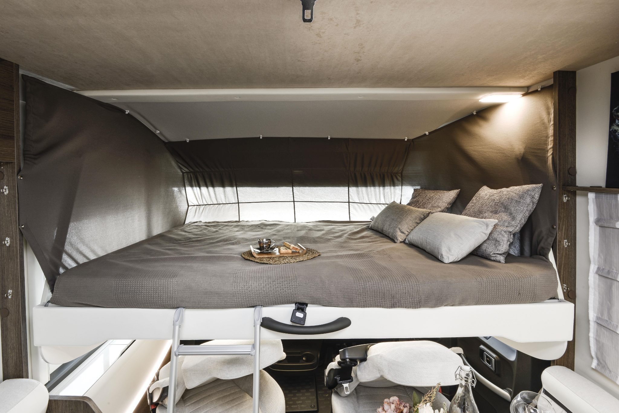 The Roller Team Pegaso 740 caters to both couples seeking unparalleled luxury in a motorhome and families looking for a blend of family-friendly living and unexpected privacy in a leisure vehicle. At the rear, there's an island bed flanked by dual wardrobes, nestled in a private bedroom secluded by the central transverse bathroom. The second double bed, a contemporary drop-down above the cab, offers substantial privacy with its surrounding curtains. The Pegaso 740 is designed to accommodate various groups of travelers, ensuring a supremely comfortable stay, be it for a brief weekend getaway or a extended journey across the country.