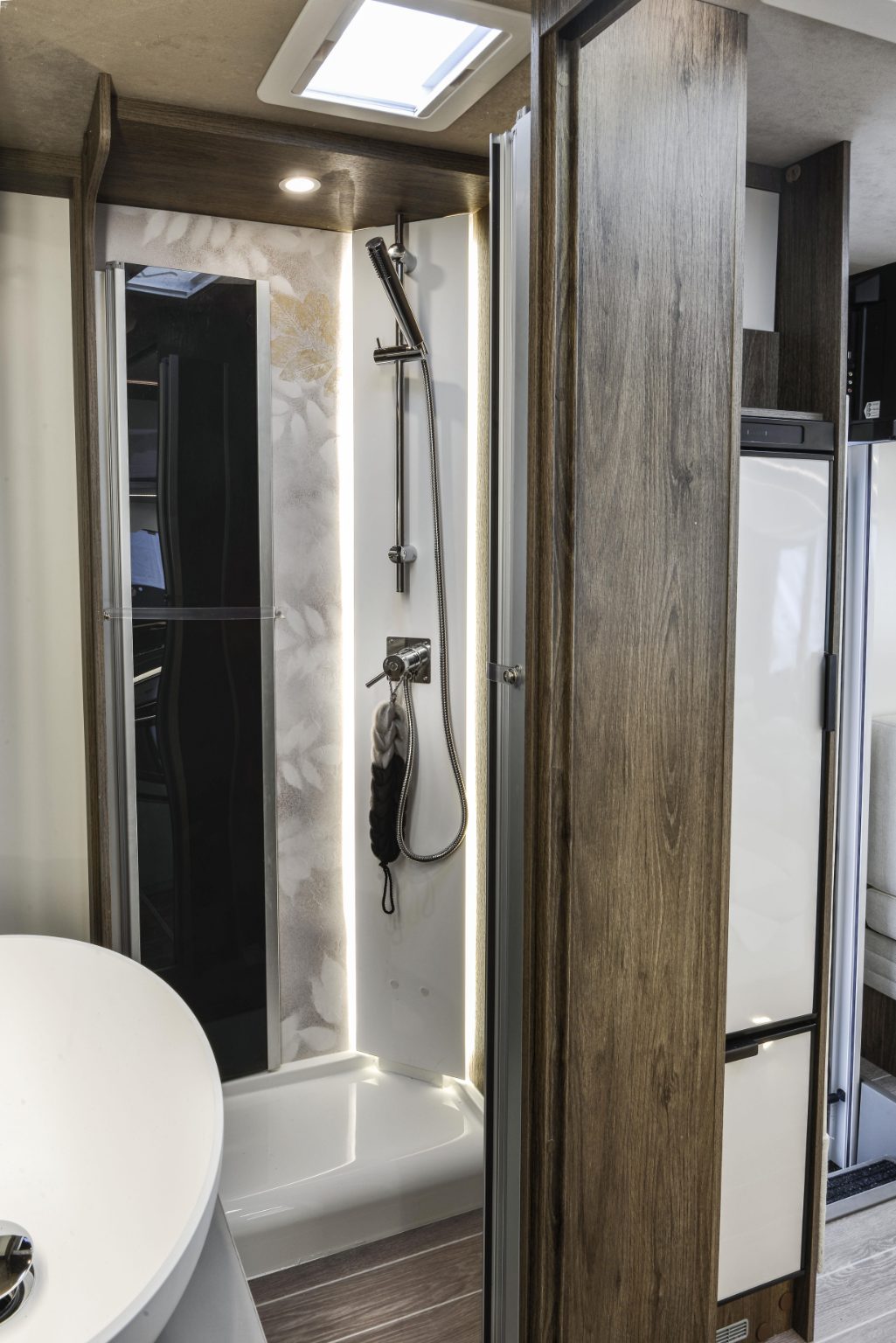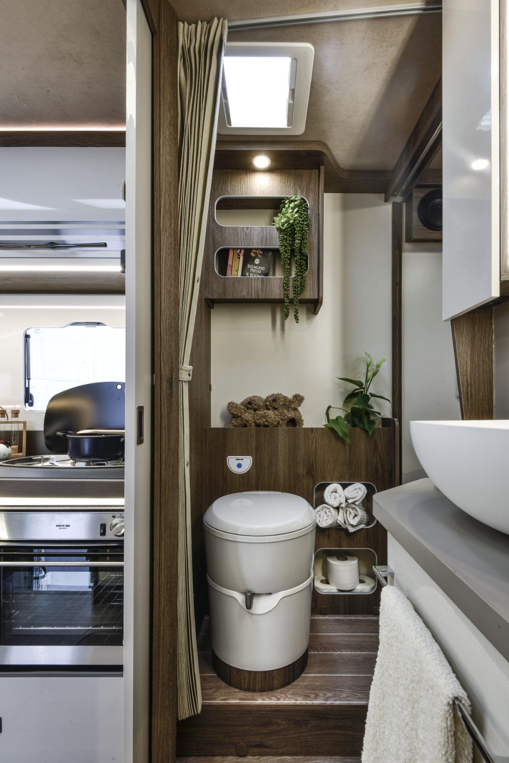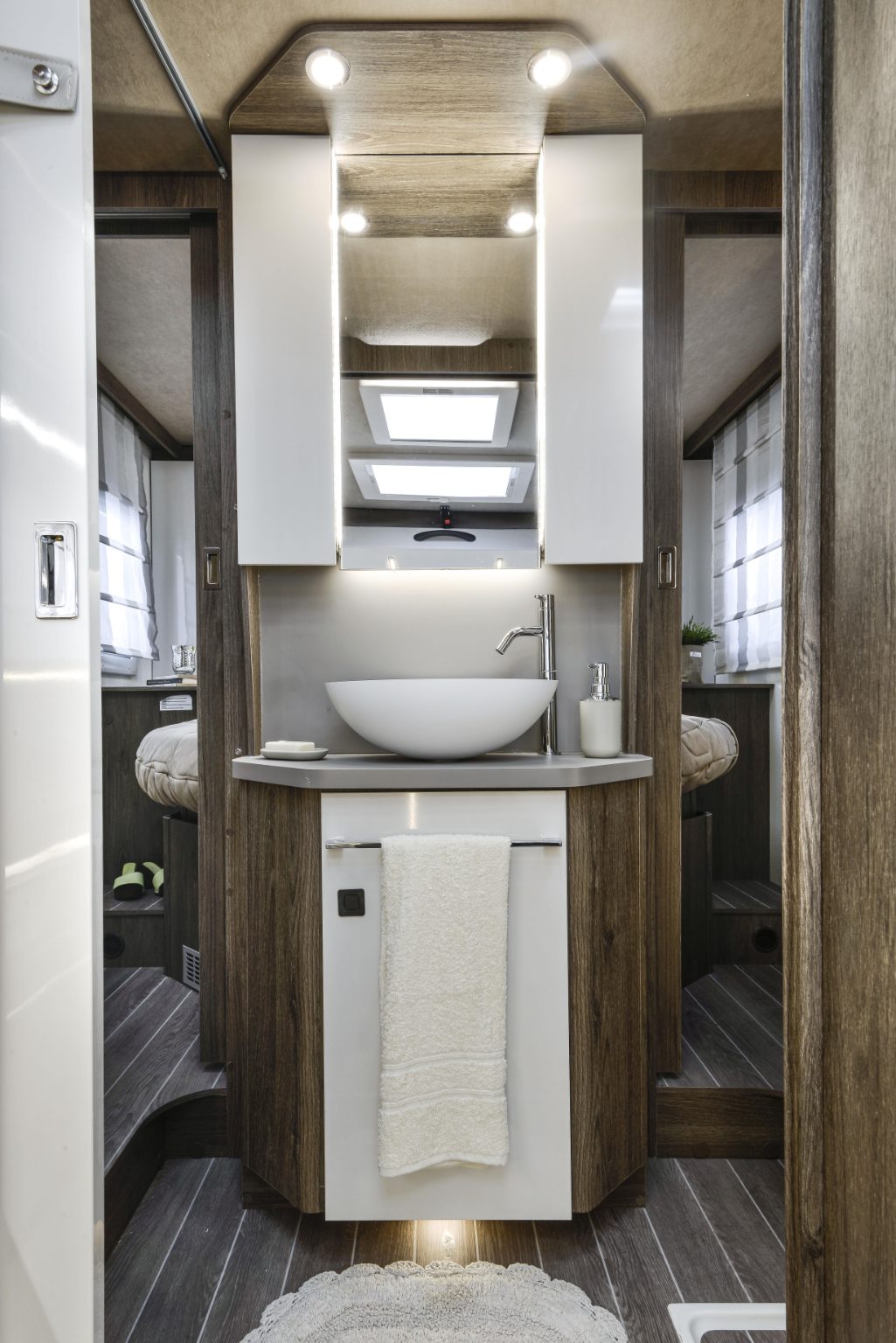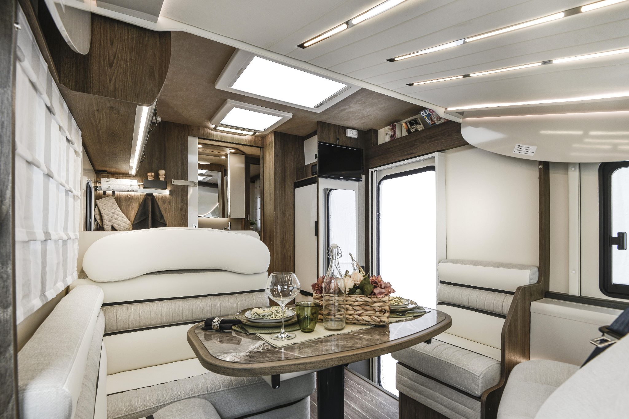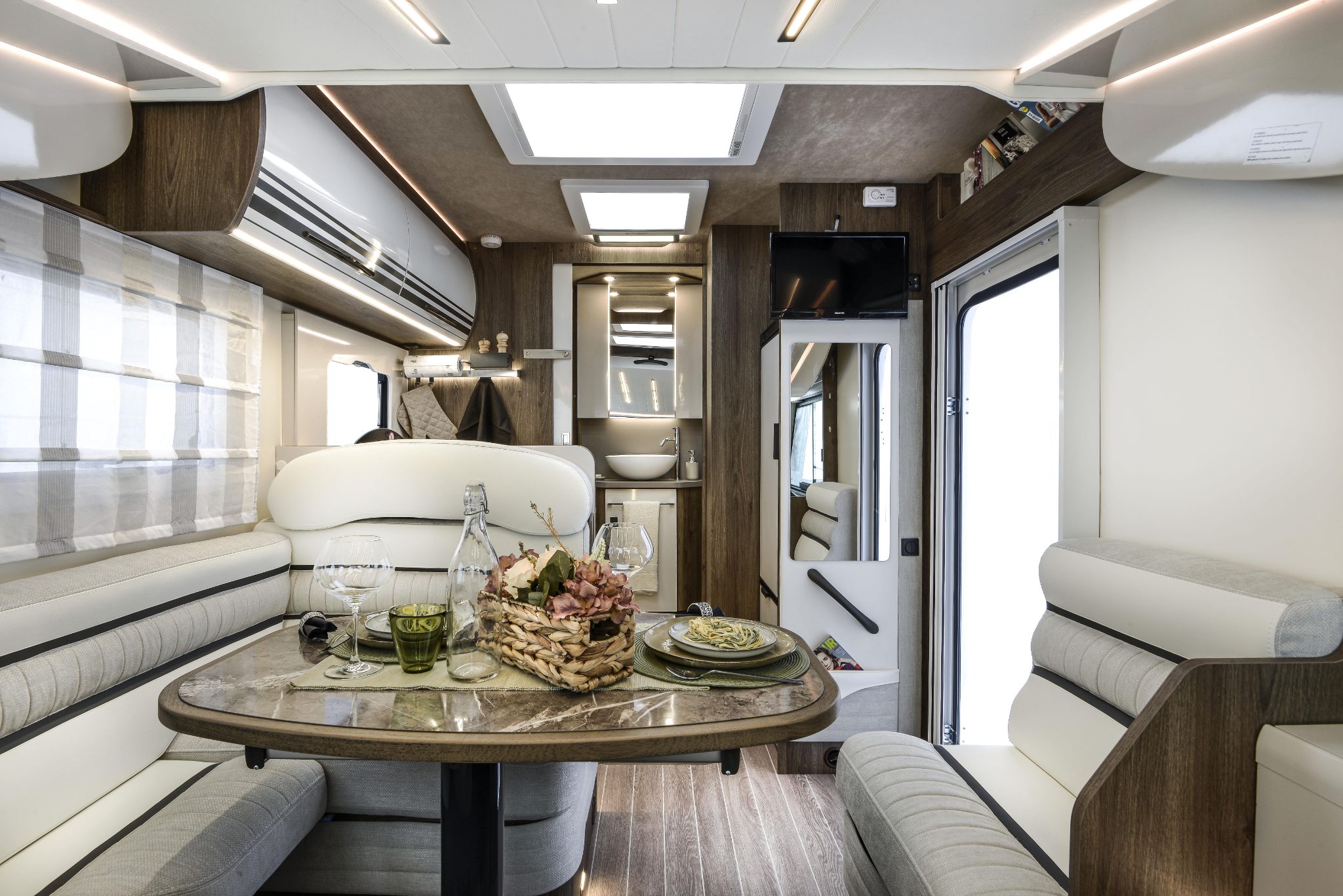 The Roller Team Pegaso 740 caters to both couples seeking unparalleled luxury in a motorhome and families looking for a blend of family-friendly living and unexpected privacy in a leisure vehicle. At the rear, there's an island bed flanked by dual wardrobes, nestled in a private bedroom secluded by the central transverse bathroom. The second double bed, a contemporary drop-down above the cab, offers substantial privacy with its surrounding curtains. The Pegaso 740 is designed to accommodate various groups of travelers, ensuring a supremely comfortable stay, be it for a brief weekend getaway or a extended journey across the country.