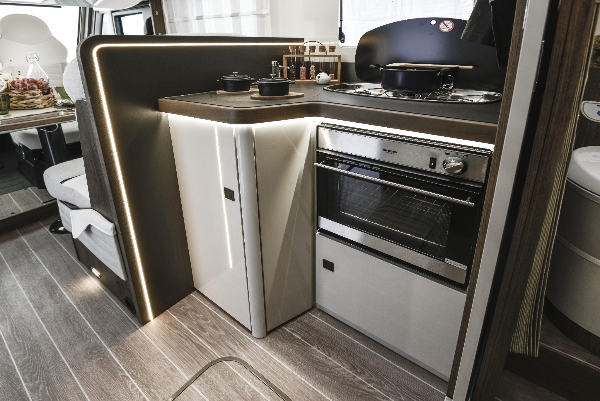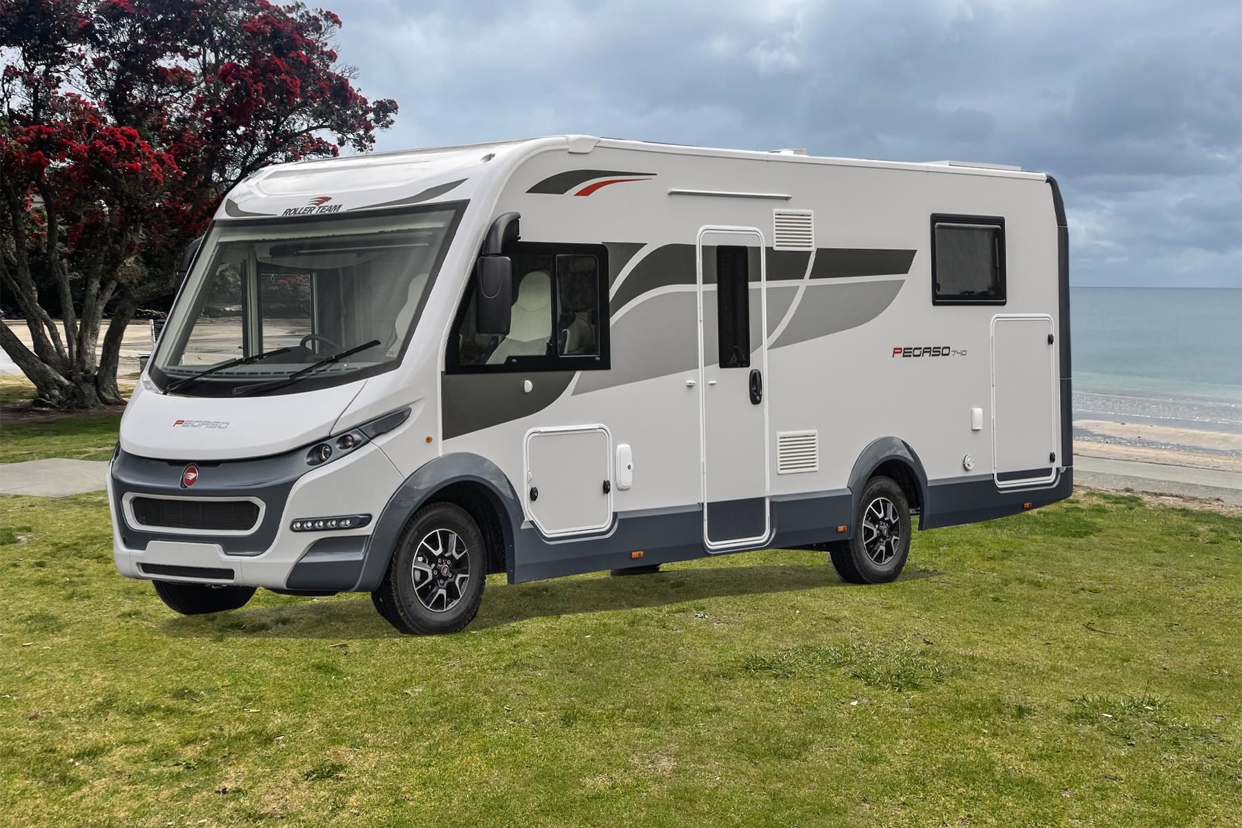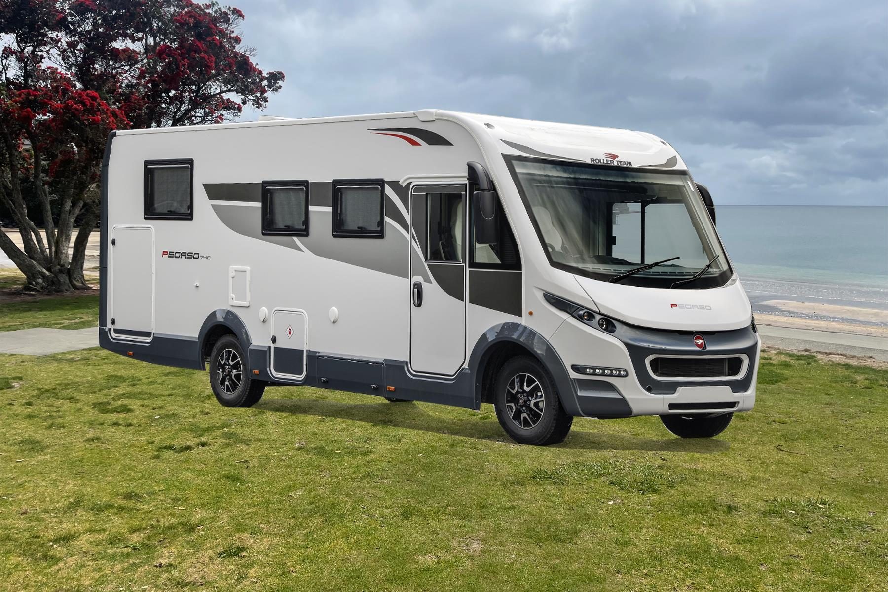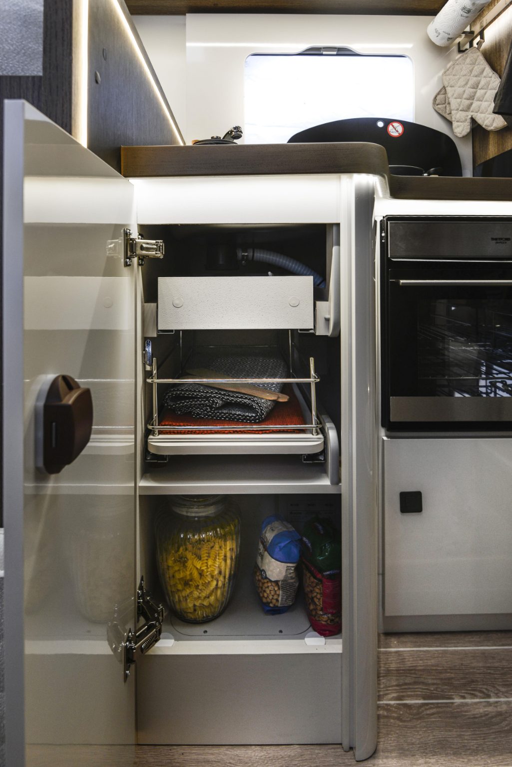 The Roller Team Pegaso 740 caters to both couples seeking unparalleled luxury in a motorhome and families looking for a blend of family-friendly living and unexpected privacy in a leisure vehicle. At the rear, there's an island bed flanked by dual wardrobes, nestled in a private bedroom secluded by the central transverse bathroom. The second double bed, a contemporary drop-down above the cab, offers substantial privacy with its surrounding curtains. The Pegaso 740 is designed to accommodate various groups of travelers, ensuring a supremely comfortable stay, be it for a brief weekend getaway or a extended journey across the country.