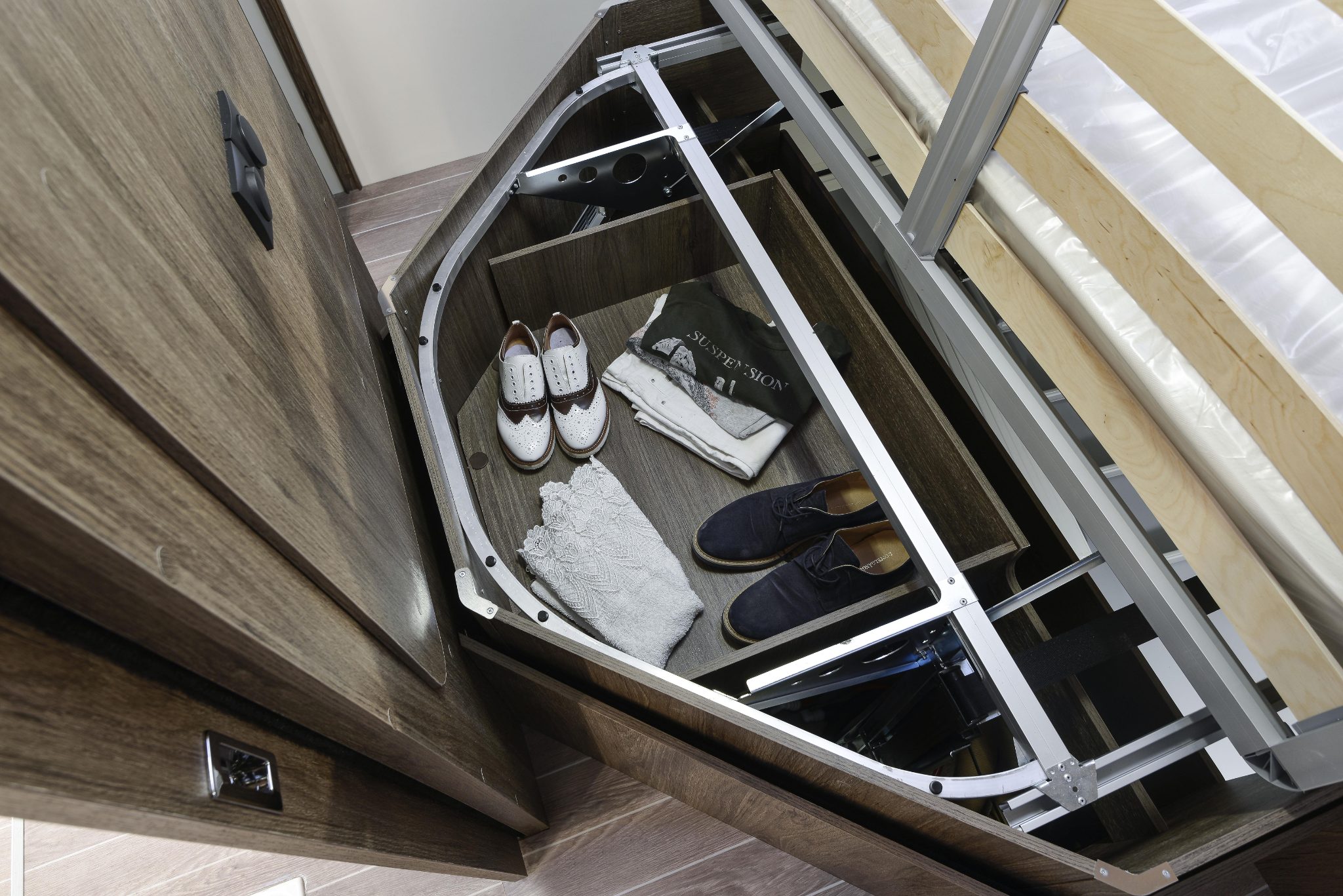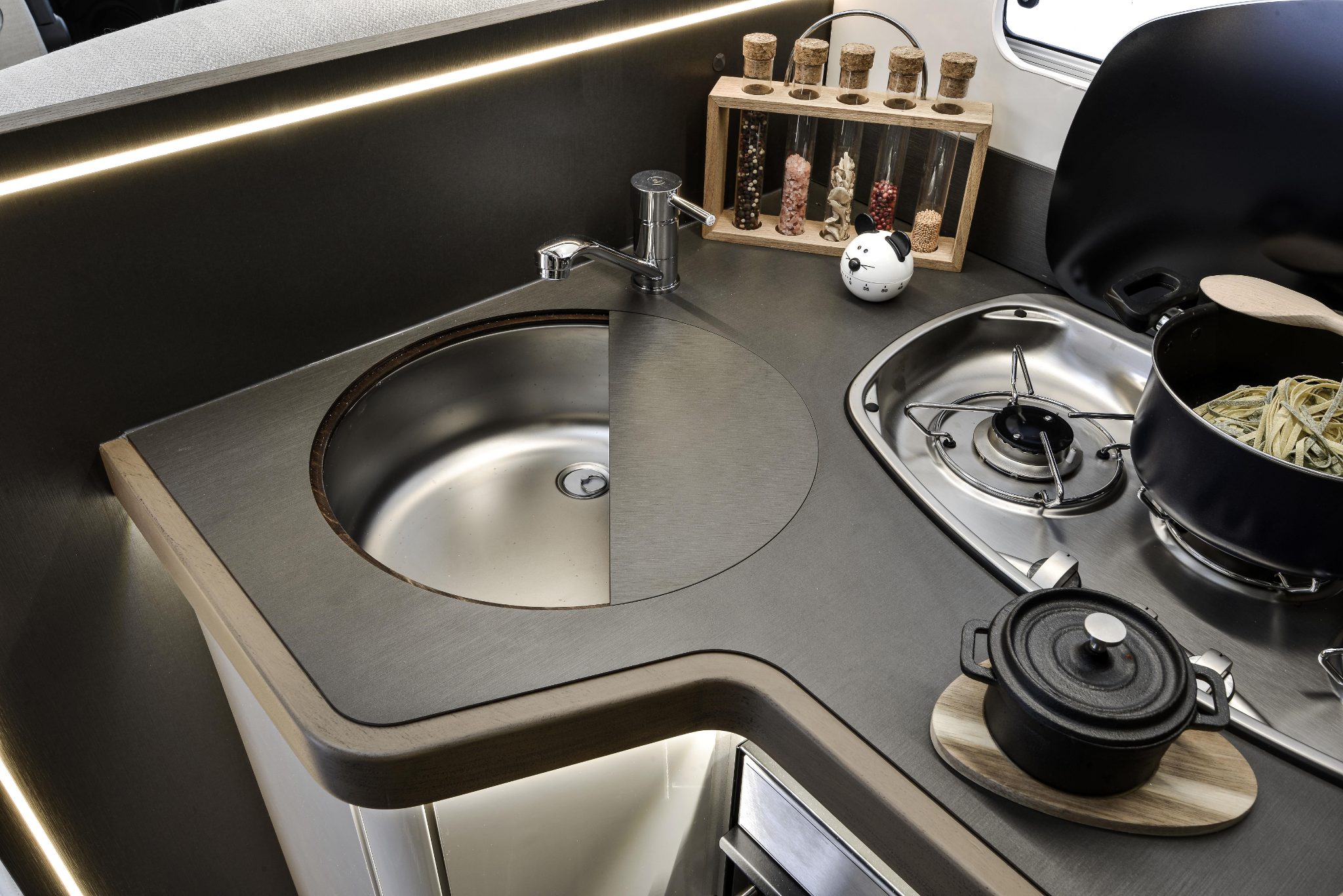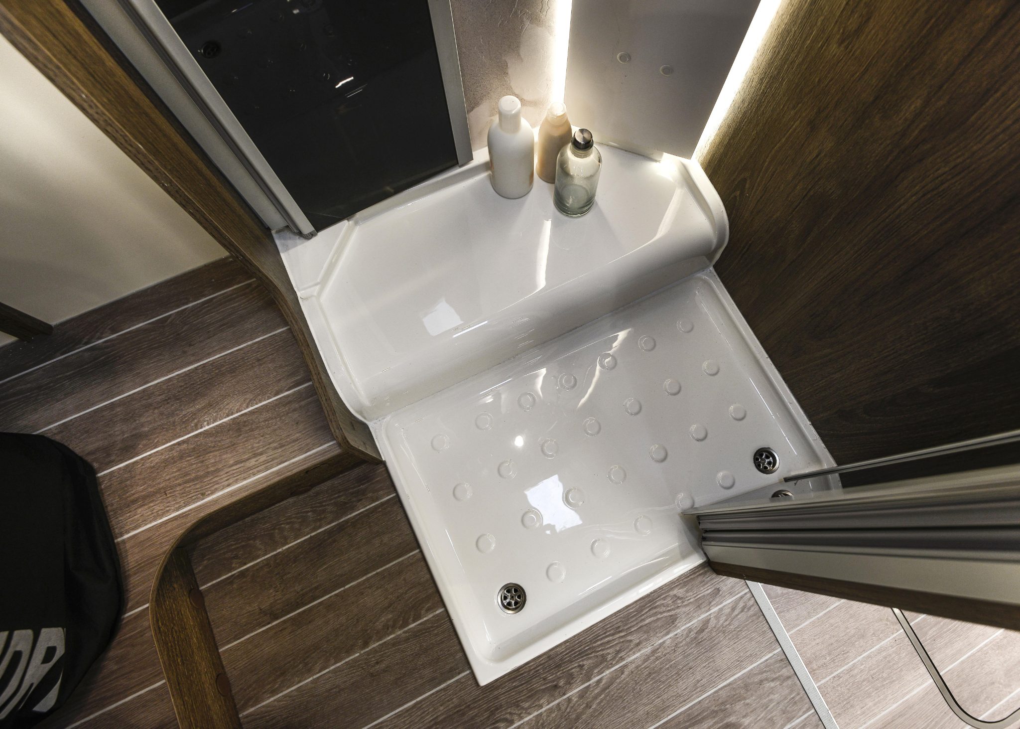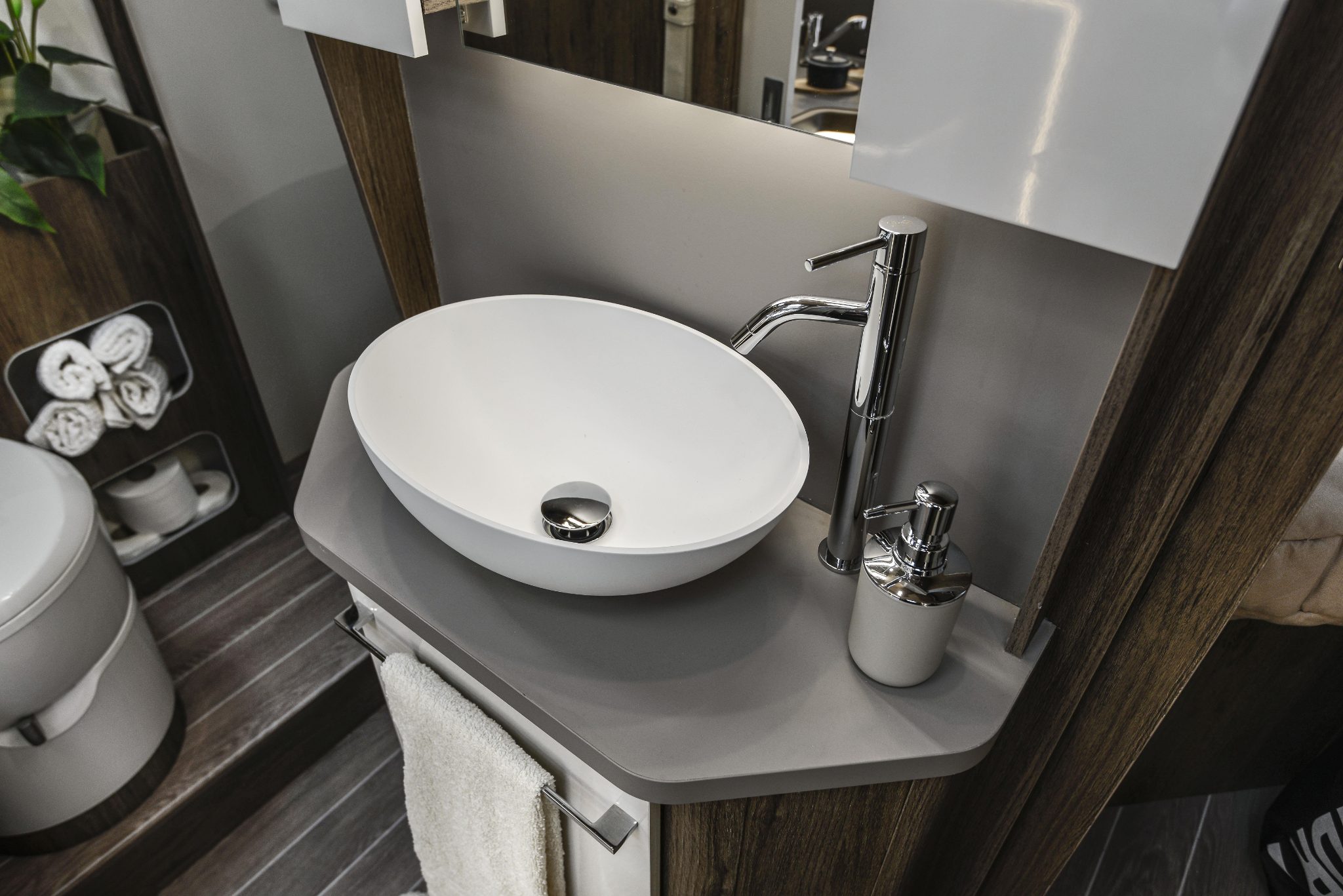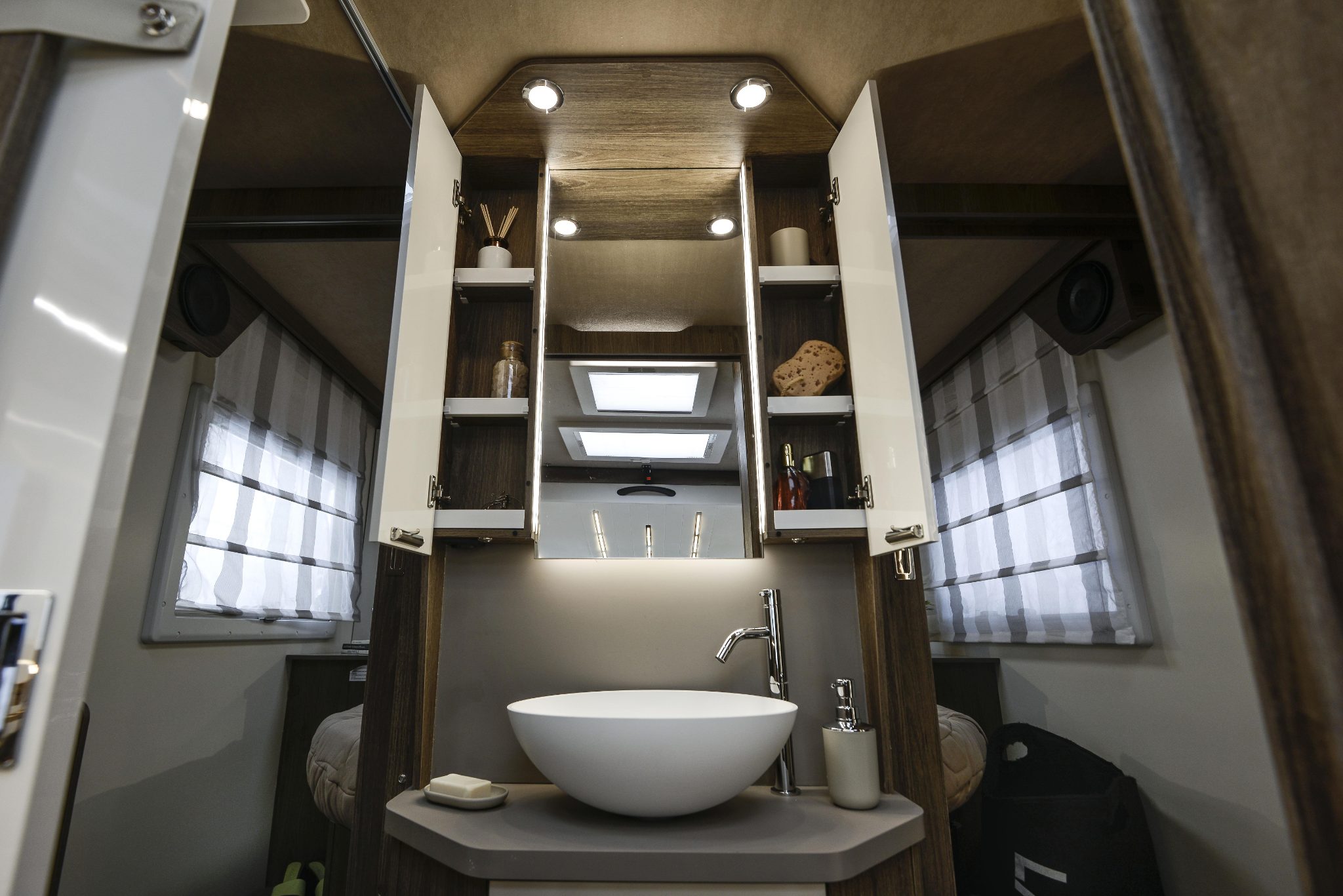 The Roller Team Pegaso 740 caters to both couples seeking unparalleled luxury in a motorhome and families looking for a blend of family-friendly living and unexpected privacy in a leisure vehicle. At the rear, there's an island bed flanked by dual wardrobes, nestled in a private bedroom secluded by the central transverse bathroom. The second double bed, a contemporary drop-down above the cab, offers substantial privacy with its surrounding curtains. The Pegaso 740 is designed to accommodate various groups of travelers, ensuring a supremely comfortable stay, be it for a brief weekend getaway or a extended journey across the country.